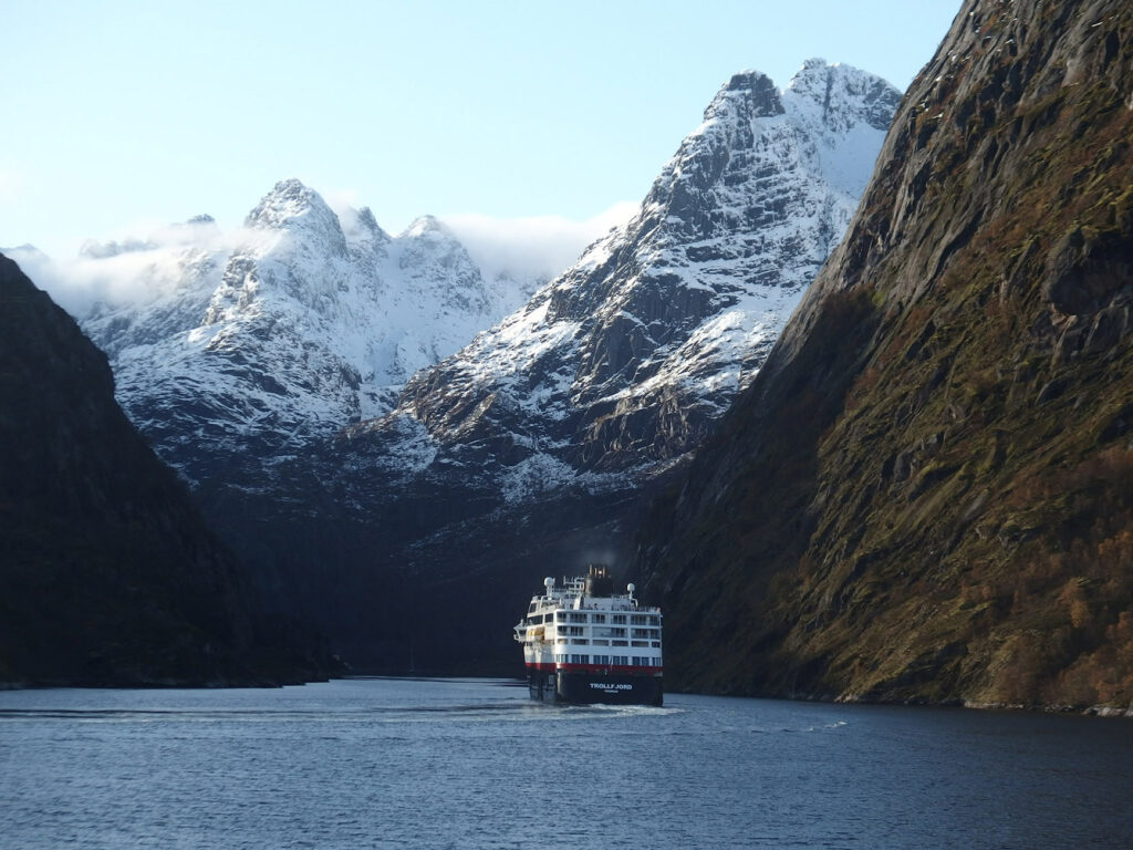 Nous regagnons ensuite l’Explorer pour le déjeuner. George, notre chef italien, nous régale avec de délicieuses côtelettes d’agneau accompagnées de polenta. Le repas se déroule pendant la navigation dans le Raftsundet, jusqu’à notre arrivée devant le Trollfjord vers 14 heures.