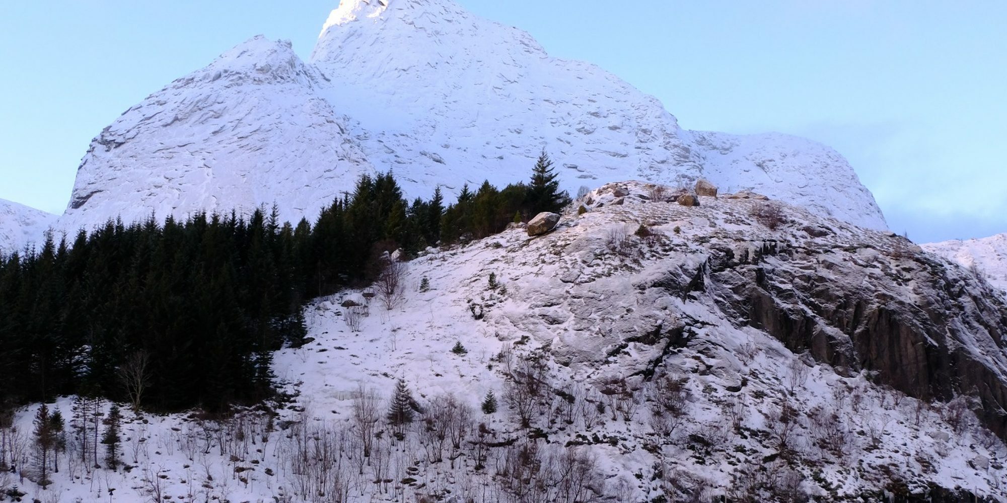 Nous entamons une marche dans la neige vers un promontoire dominant le fjord. À mesure que nous progressons, le décor se déploie avec majesté : les pics déchiquetés se dressent dans toute leur verticalité, encadrant les maisons colorées disséminées le long du rivage. Les teintes deviennent plus douces, presque poudrées, et offrent un tableau d’une finesse saisissante.