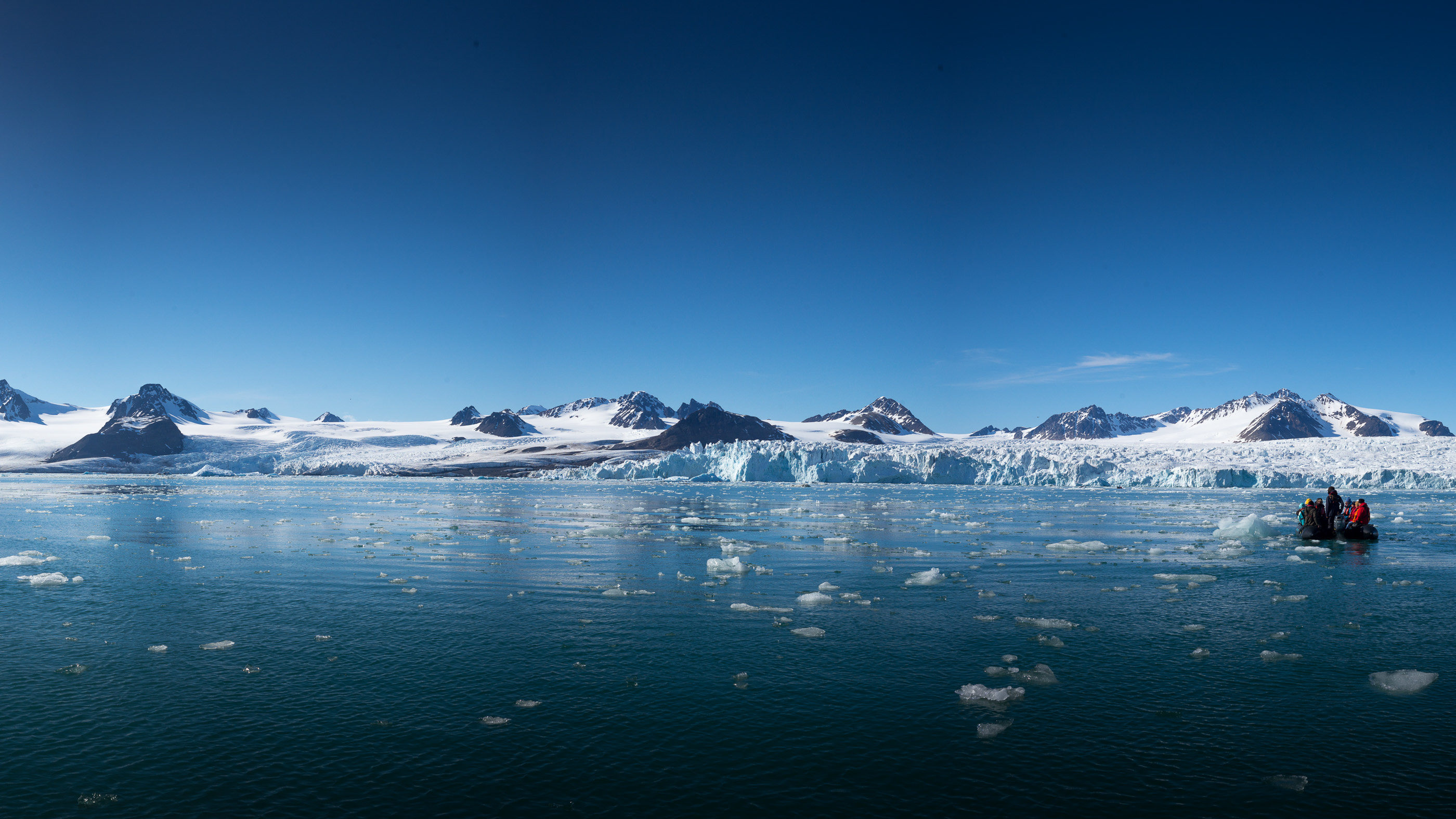 17 heures : Le bateau est maintenant à 600 mètres de l’un des plus beaux glaciers de l’archipel, appelé glacier de Monaco en souvenir des expéditions du Prince. Nous embarquons à nouveau sur les Zodiacs, nous sommes appelés groupe par groupe depuis le salon, pour 2 à 2h30 de croisière Zodiac devant ce front de glaces de 5 kilomètres de longueur, enchâssé dans les pics culminant à 1100 mètres d’altitude. Le fjord est encombré d’icebergs, preuve du recul rapide de ce glacier, aussi…