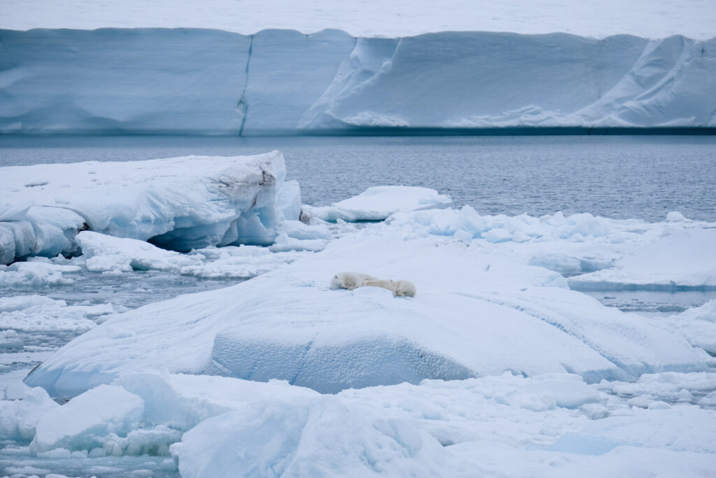 À bord de notre yacht polaire, nous sommes restés là, immobiles, à contempler cette scène fragile et infiniment douce — comme si l’Arctique nous offrait, pour quelques instants, un privilège rare. Puis, presque imperceptiblement, l’ourse s’est redressée. Peut-être avait-elle perçu un mouvement, deviné la présence d’un phoque au loin…