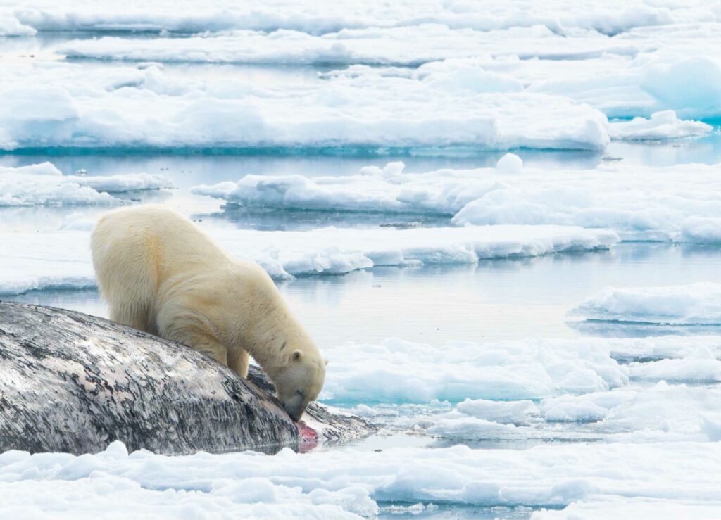 Incroyable à observer, ses pattes énormes qui tentent de prendre prise sur la peau épaisse et glissante, il veut planter ses crocs dans cette armure résistant à l’assaut des flots, résistant à ceux qui voudraient le sortir de sa sépulture blanche. Nous sommes en Arctique – au Svalbard, ici, même morte la Nature y demeure hostile et ne cèdera pas à un seul de ses assaillants. La tâche ne sera pas facile mais l’ours est affamé, le ballet des oiseaux apporte un peu de légèreté, ils se repaissent des débris, virevoltent tout autour, prennent un bain et laissent le prédateur opérer avec ses griffes et ses crocs, d’une précision chirurgicale.