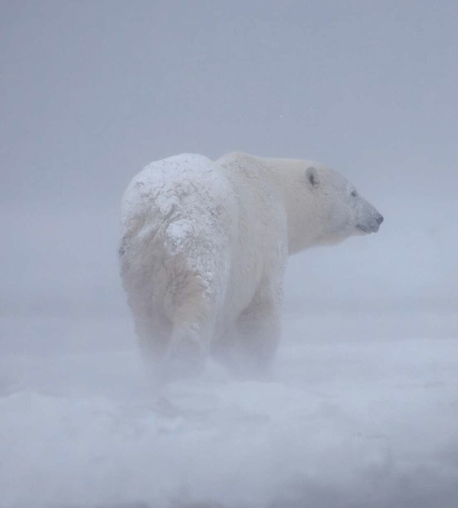 Enfin… ! Une robe crème aux poils bien longs, des grosses fesses puissantes pour une queue presque invisible, un ventre ballotant de graisse et un long cou curieux, de gros serpent presque, dont la truffe noire cherche les odeurs ; des pas rapides et puissants, et une souplesse étonnante pour cette lourde silhouette qui maraude entre les blocs de glace échoués sur la plage…