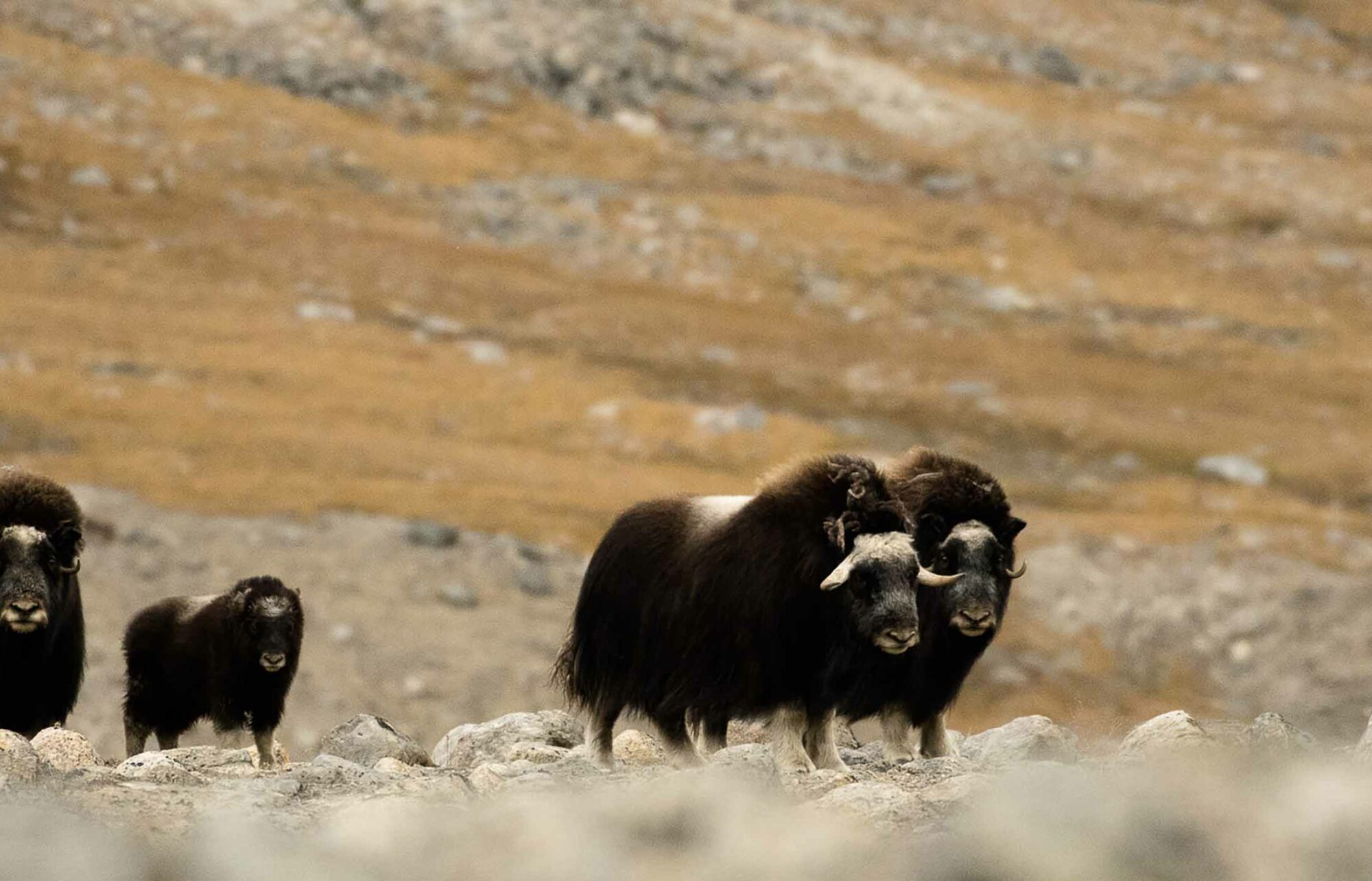 Animal mystérieux semblant tout droit sorti de l’âge de glace, vous aurez peut-être la chance de le croiser dans les fjords du Groenland, l’Arctique canadien ou certains massifs norvégiens. Il est notamment connu pour ses affrontements entre mâles, s’élançant l’un vers l’autre à toute vitesse tête baissée, et pour sa formation défensive face aux prédateurs, en cercle. Il semble imperturbable, capable d’affronter le blizzard avec le plus grand calme, calfeutré qu’il est derrière son immense fourrure. Moins répandu que le renne, avec lequel il partage son environnement, il n’en demeure pas moins l’une des grandes figures charismatiques du Grand Nord.