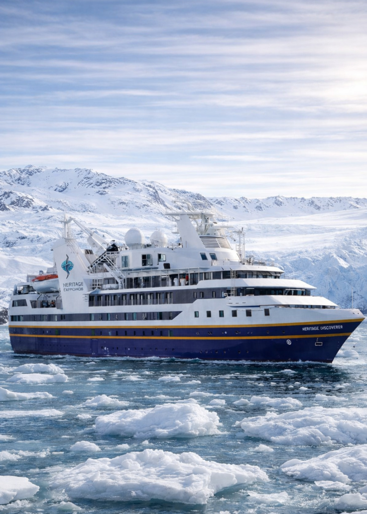 Dès 2026, Embarquez à bord de l’Heritage Discoverer, anciennement connu sous le nom d’Exploris One, un navire d’expédition de seulement 98 passagers, pour une exploration exceptionnelle du Spitzberg et du Groenland.