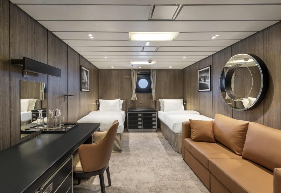 Avec une capacité de 150 passagers mais n’en accueillant que 98, le Terra Nova allie l’héritage maritime traditionnel à l’expérience moderne de l’expédition. Sa récente rénovation en 2022 a apporté des touches raffinées dans l’ensemble du navire, depuis l’ameublement contemporain des cabines jusqu’aux espaces communs repensés, créant une atmosphère de confort et de style modernes. Construit au Royaume-Uni, le Terra Nova est un navire d’expédition robuste et polyvalent.